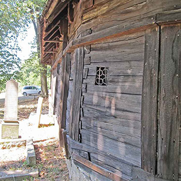 Фотографија која приказује деформацију темељног зида од камена и зидова од талпи на јужној страни цркве снимљена на дан 21.08.2012. године