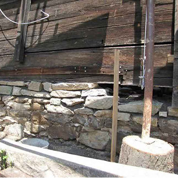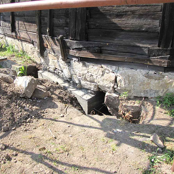 Фотографија која приказује деформацију темељног зида од камена и зидова од талпи на јужној страни цркве снимљена на дан 21.08.2012. године