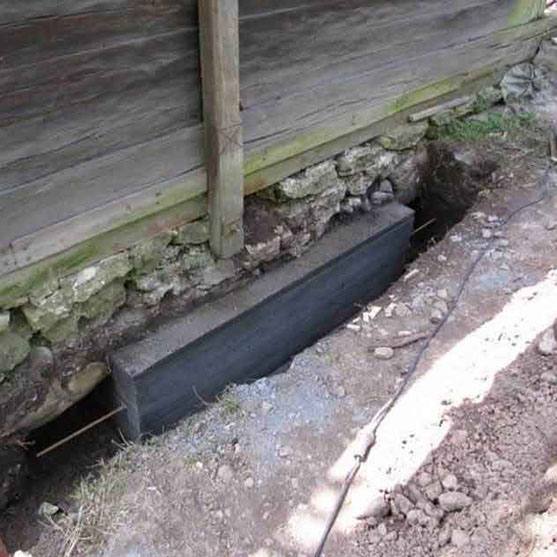 The foundations are made of broken stone with both faces of the wall finished in lime mortar. The thickness of the foundation walls is 50 cm, while their height is 70 cm, measured from the wooden foundation sill to the bottom of the foundation wall, providing a depth of foundation ranging from 55 cm to 30 cm, depending on the terrain slope and the sidewalk level. The condition of the foundations was very poor. The bonding material on the outer side of the foundation walls was completely disintegrated and crumbling, and in large areas, it was entirely absent. The most critical condition of the foundations was observed on the southern side of the church, in the section leading to the apse. There, the foundation wall cracked and completely deviated from its geometric position. The rest of the structure above the foundation followed this deformation (foundation sill, columns, beams...) thus endangering the overall static integrity of the building. Measurements revealed significant deviations in the horizontal alignment of the upper surface of the foundation zone, reaching up to 30 cm in the longitudinal direction (east-west).