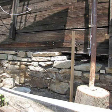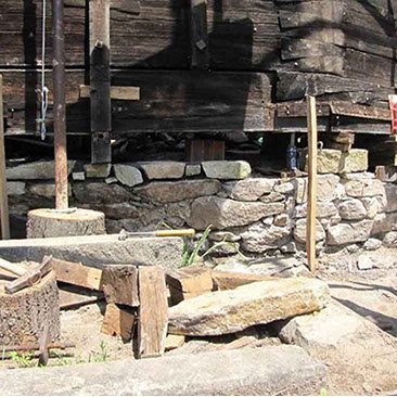 The wooden structure was lifted and the foundation walls leveled with stone masonry – June 19, 2015.