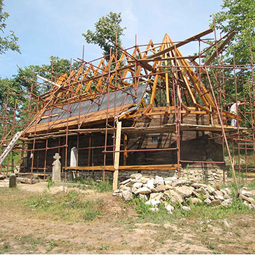 The existing slightly overhanging eaves were not cladded, but traces on the structure clearly indicate the former presence of cladding. The barrel vault inside the church, made of wooden shingles, was in extremely poor condition, and it was not possible to reinstall the existing pieces. The wooden rosette, richly decorated with carvings and placed above the chandelier, was also impossible to save.